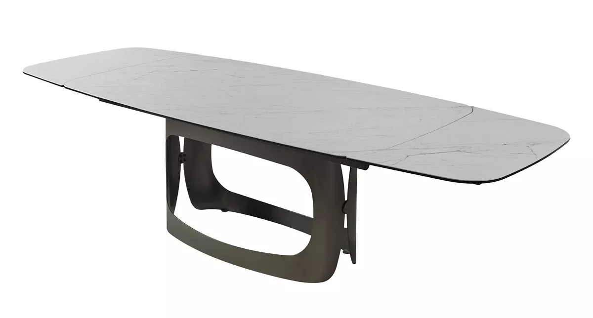 - двухсторонняя торцевая система раскладывания, две независимые вставки по краям по 50 см позволяют увеличить длину столешницы до 250 или 300 см при необходимости, испанская керамика, толщина столешницы 13 мм (3 мм керамика + 10 мм закаленное стекло), не впитывает загрязнения, термостойкая;