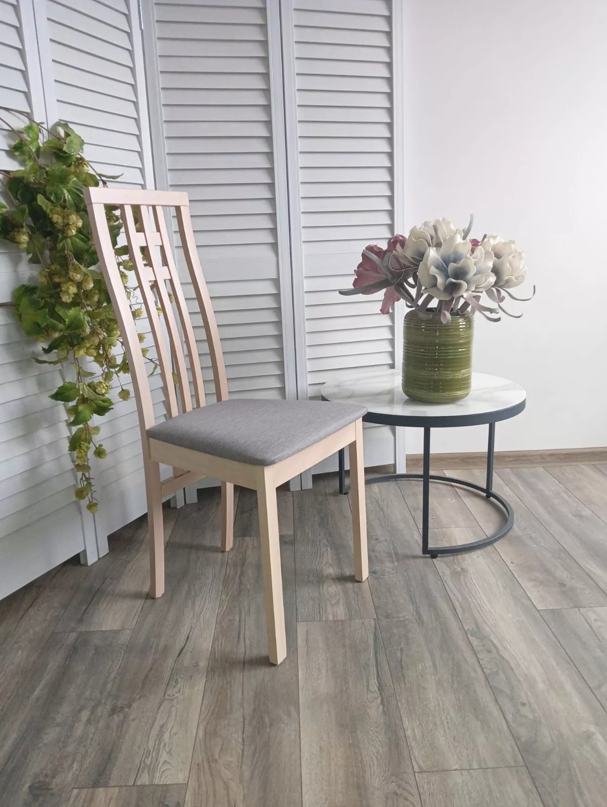 Каркас стула выполнен из массива бука, сиденье обито тканью.