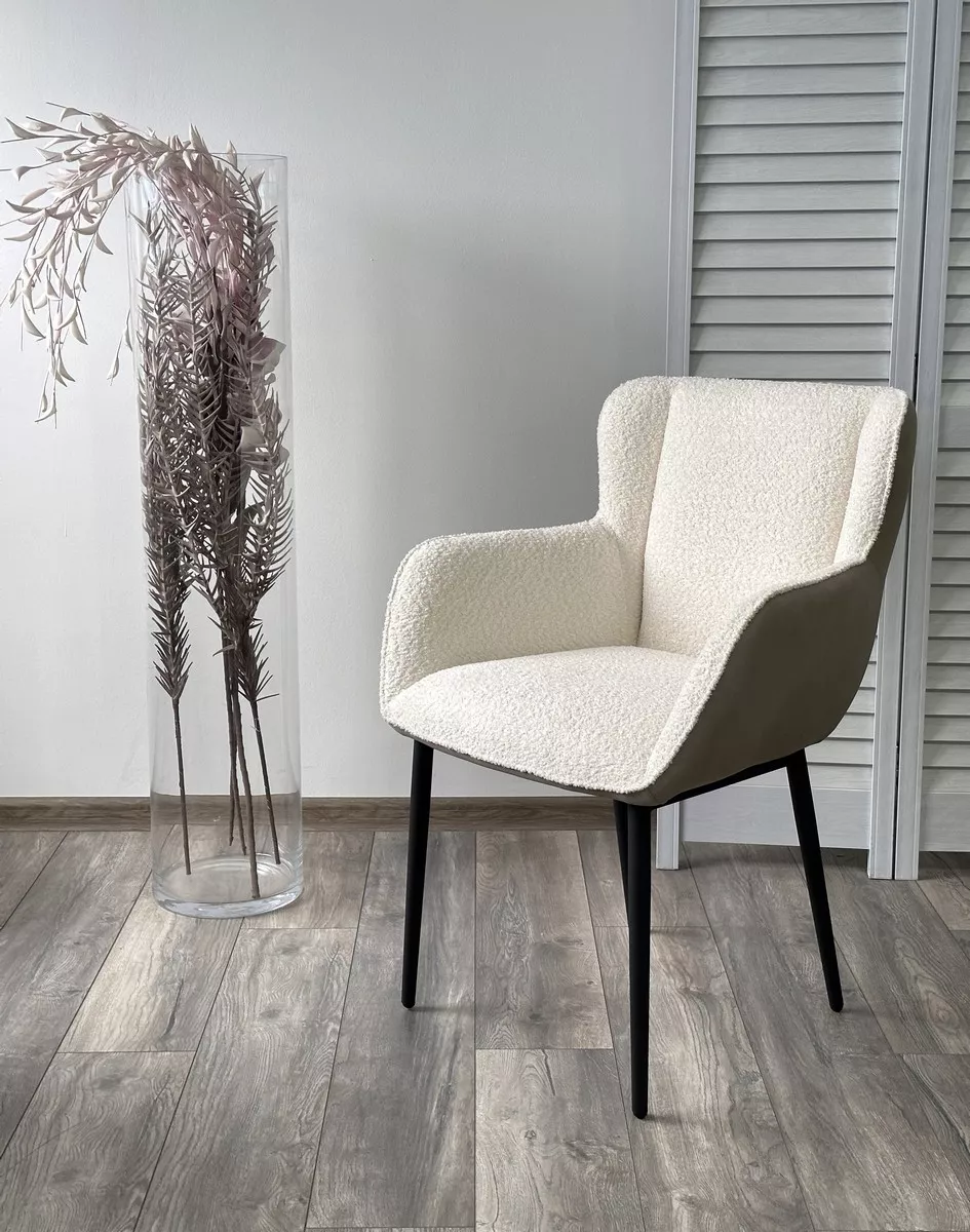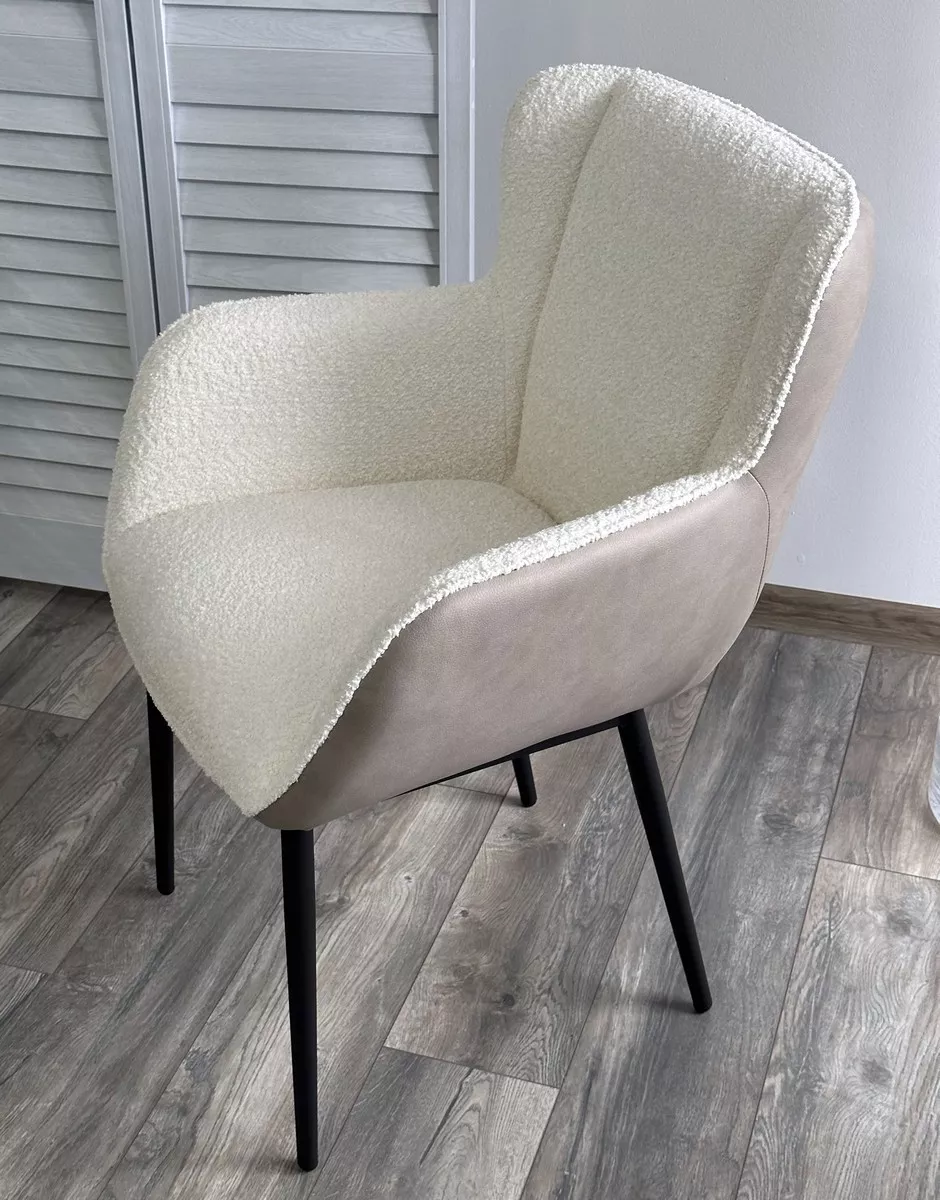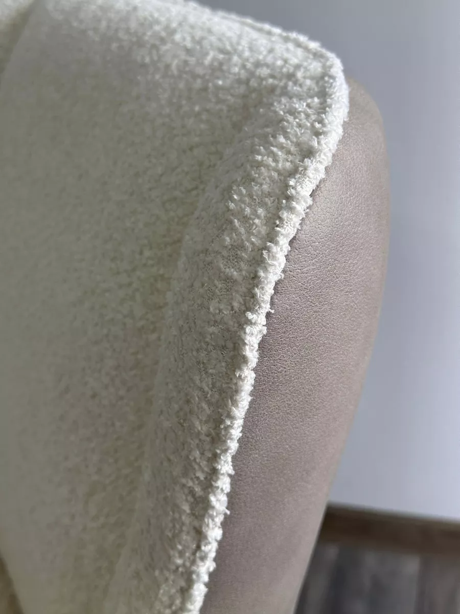 Обивка лицевой стороны стула - ткань букле белого цвета, тыльной стороны - экокожа светло-бежевого цвета.