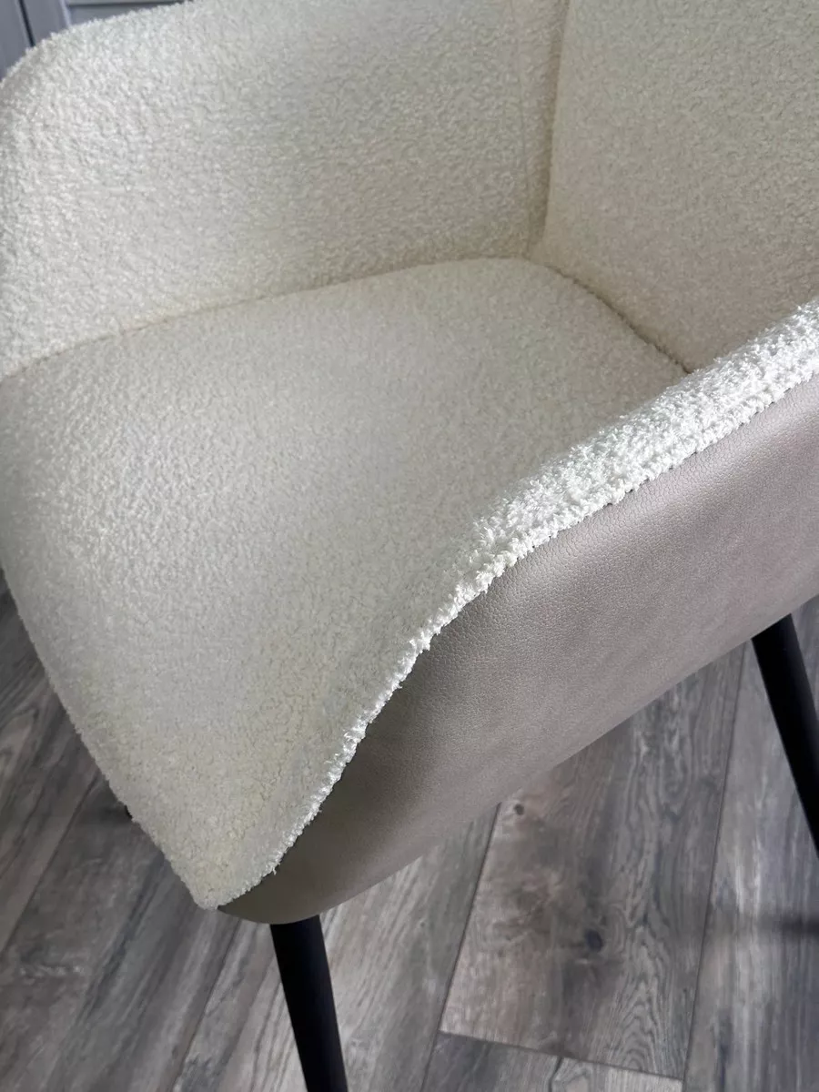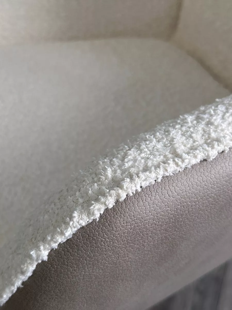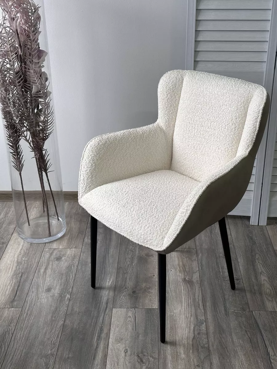 Обивка лицевой стороны стула - ткань букле белого цвета, тыльной стороны - экокожа светло-бежевого цвета.