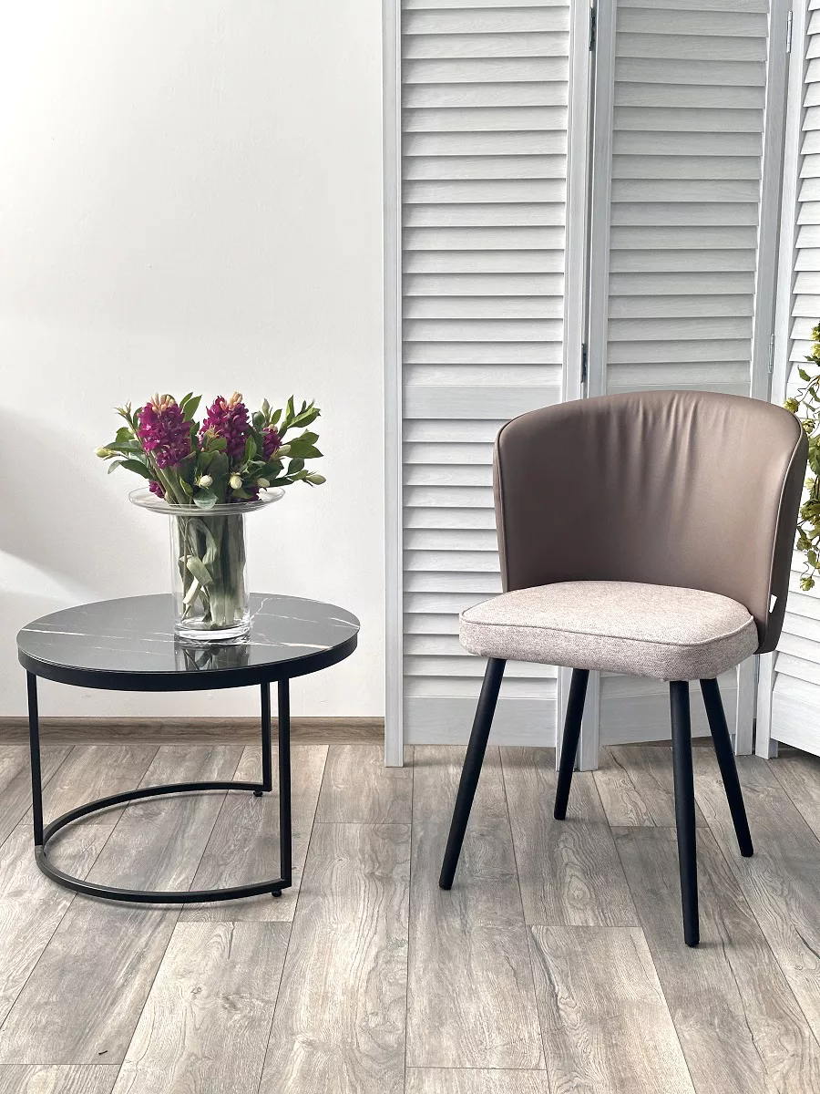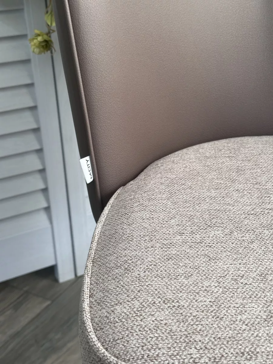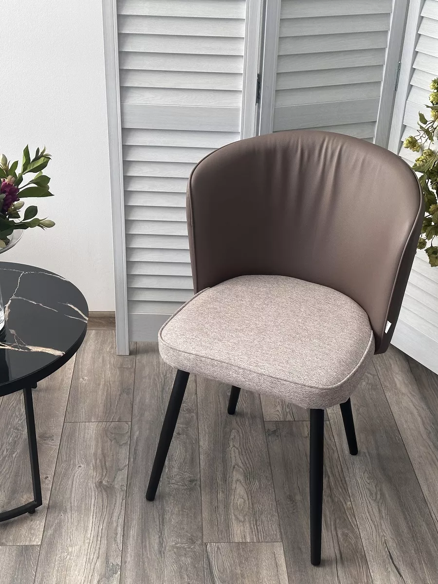 Комбинированная обивка: сиденье - ткань бисквитного цвета, спинка - экокожа серого цвета.