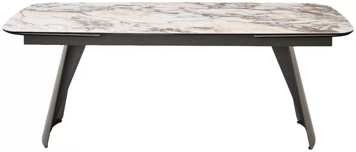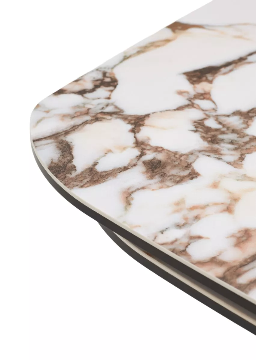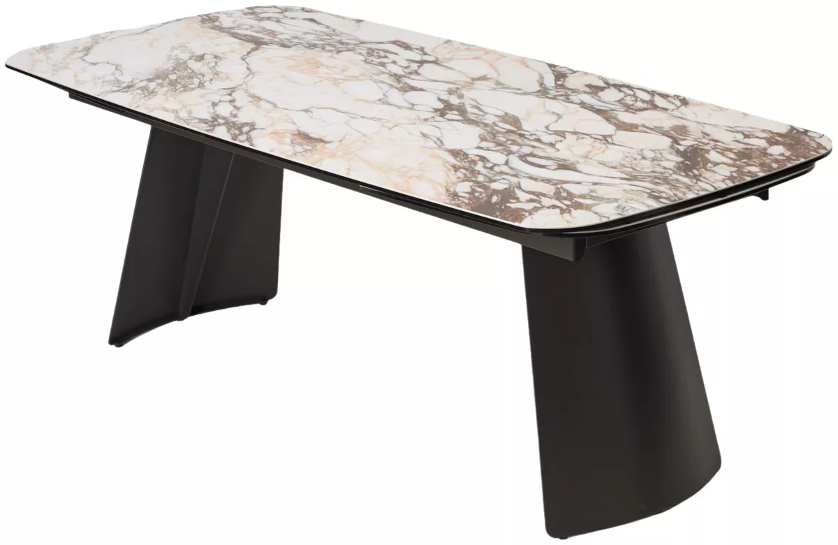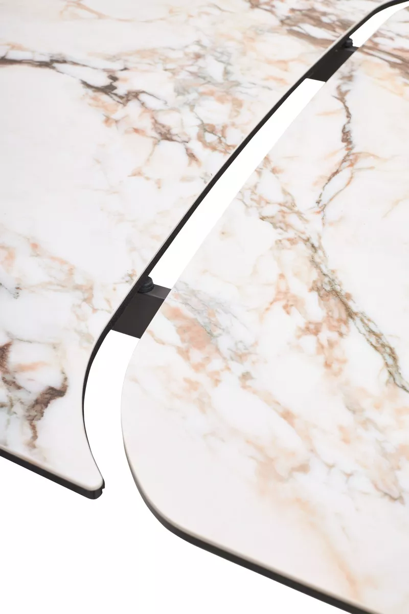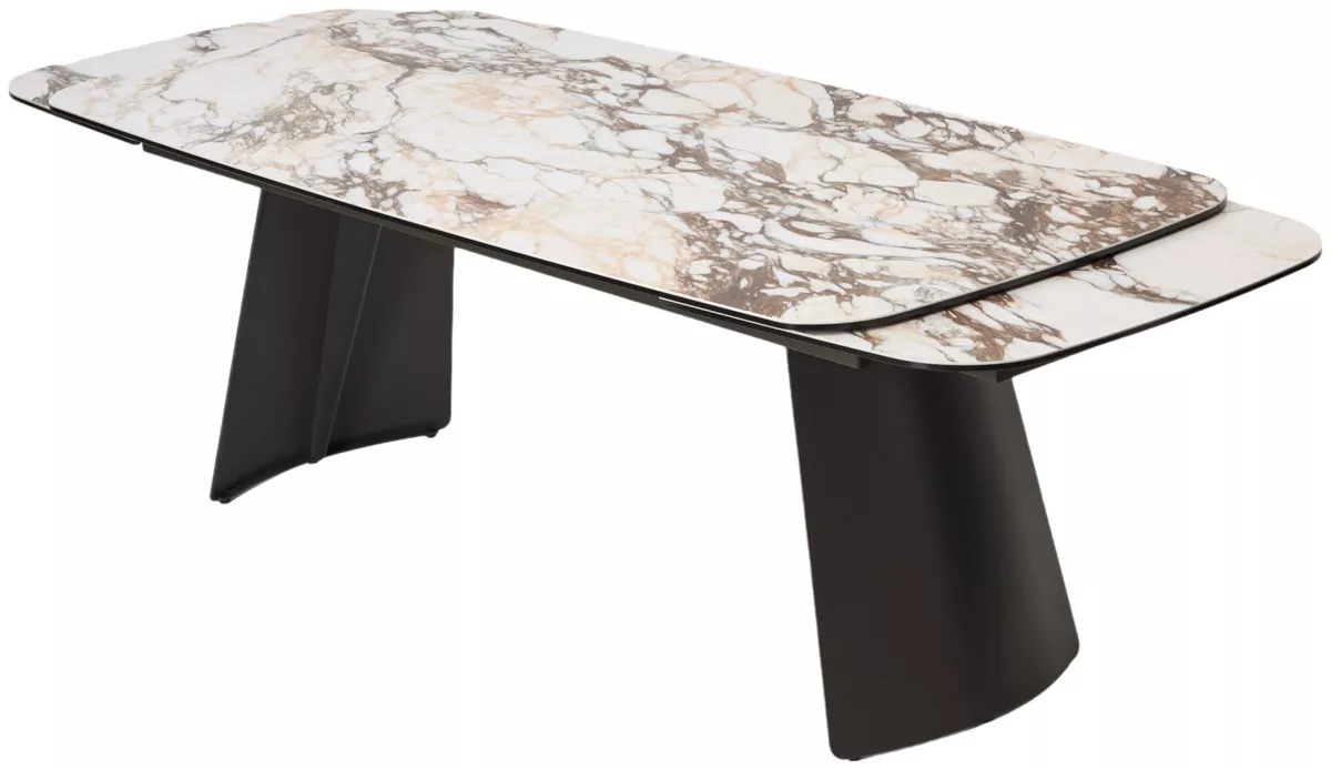 - двухсторонняя торцевая система раскладывания, две независимые вставки по краям по 50 см позволяют увеличить длину столешницы на 250 или 300 см при необходимости, испанская керамика, толщина столешницы 13 мм (3 мм керамика + 10 мм закаленное стекло), не впитывает загрязнения, термостойкая;