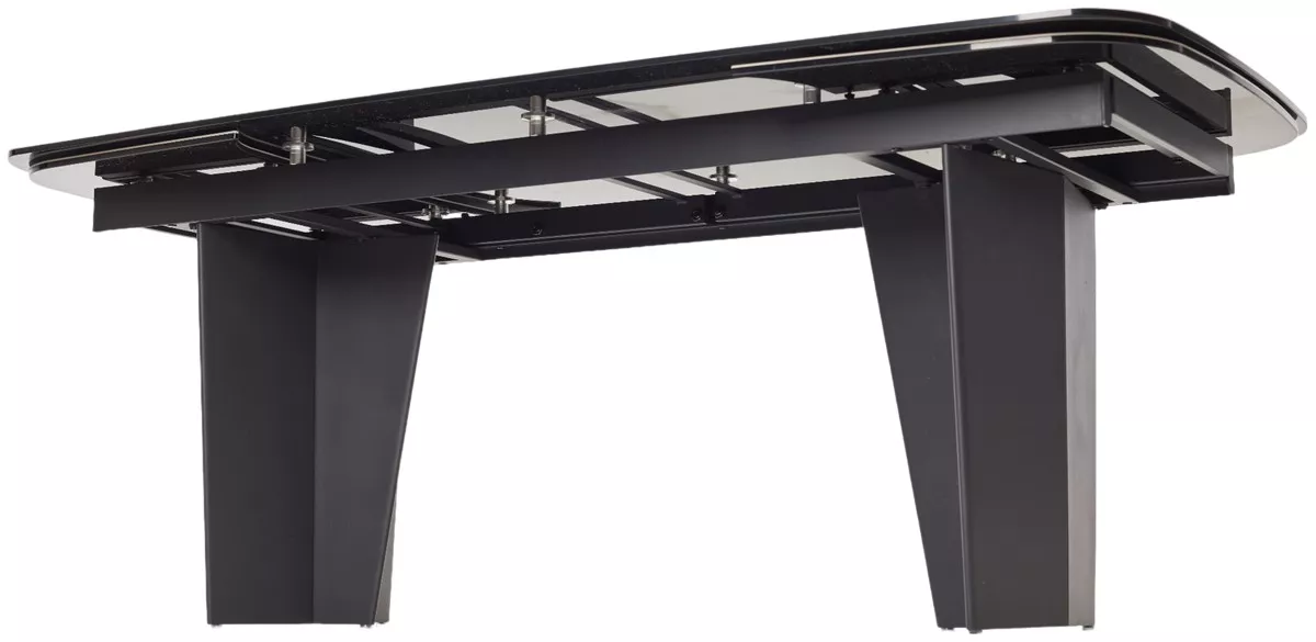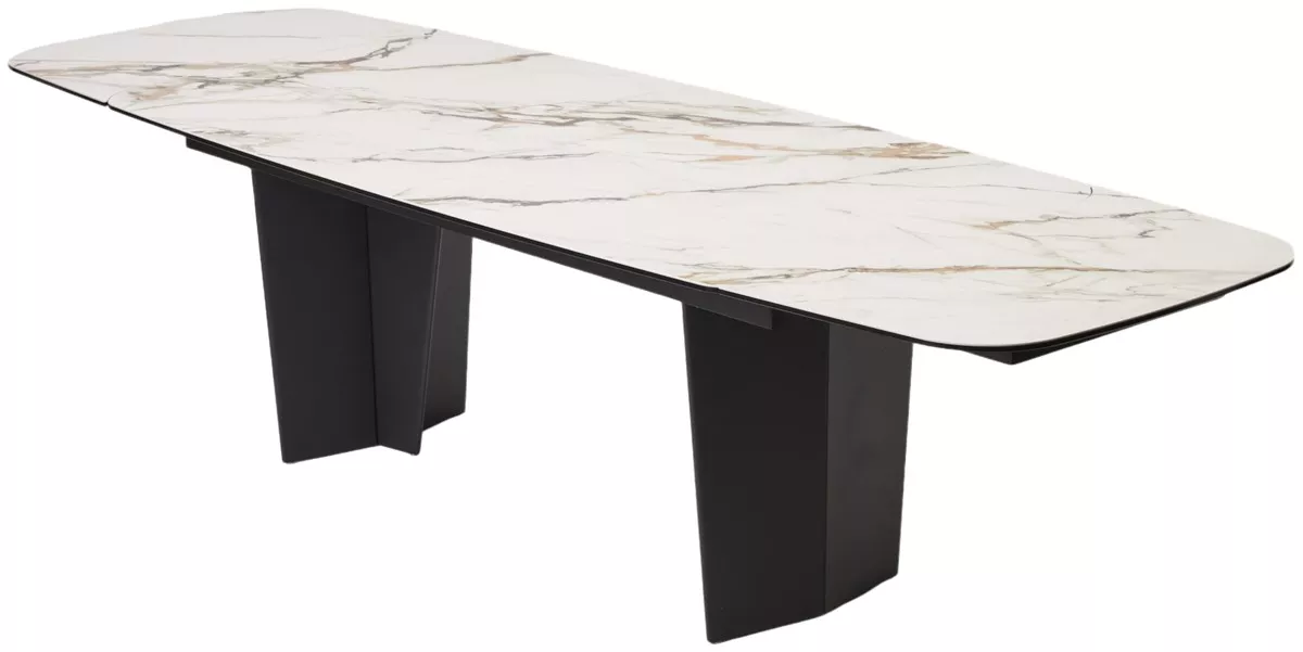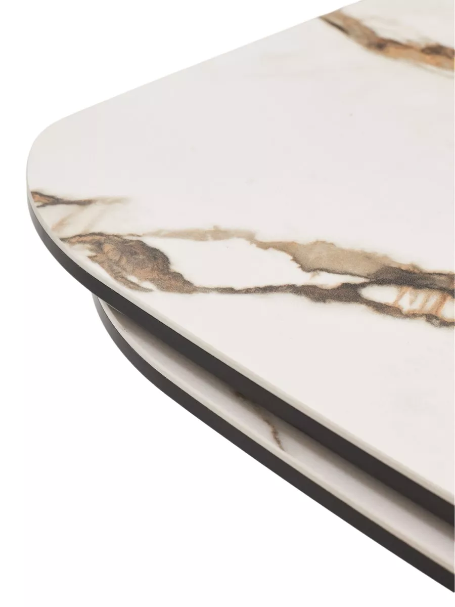- двухсторонняя торцевая система раскладывания, две независимые вставки по краям по 50 см позволяют увеличить длину столешницы на 250 или 300 см при необходимости, испанская керамика, толщина столешницы 13 мм (3 мм керамика + 10 мм закаленное стекло), не впитывает загрязнения, термостойкая;