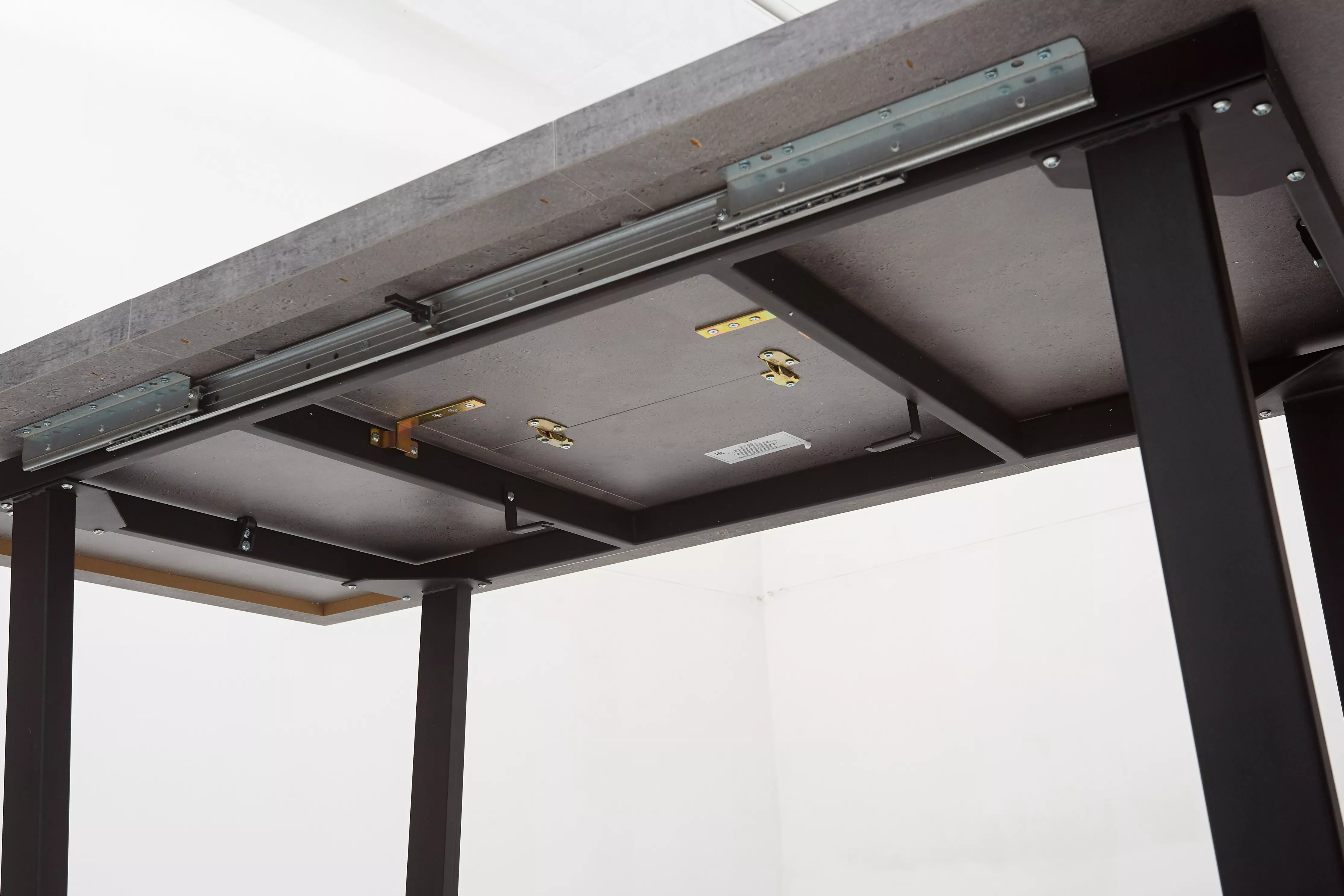 Столешница - ламинированный ДСП. Толщина столешницы 36 мм по бортикам, 18 мм - по центру. Немецкий механизм раскладывания POTTKER. Металлическая рама под столешницей. Ножки стола крепятся к металлической раме,